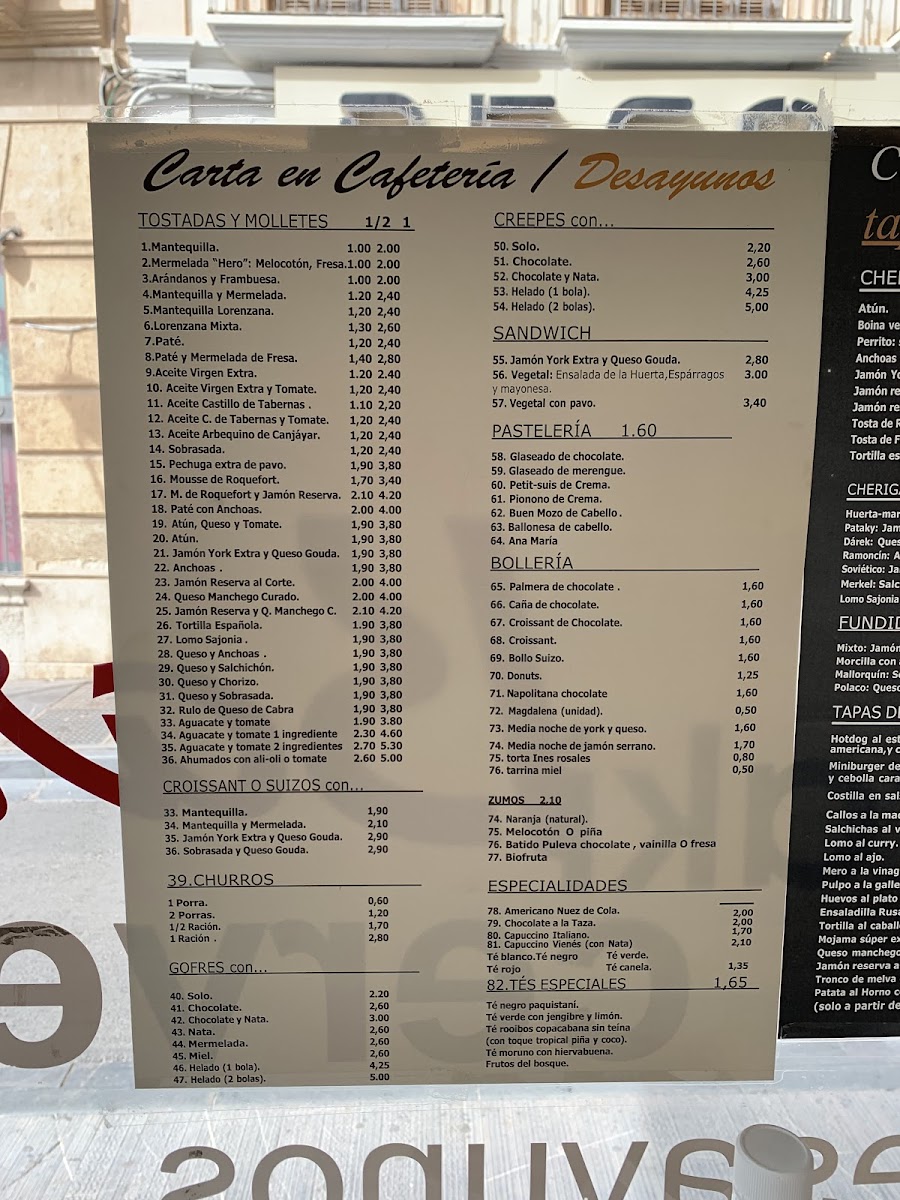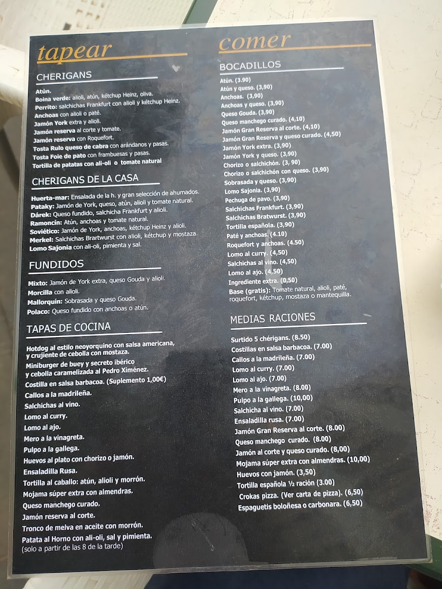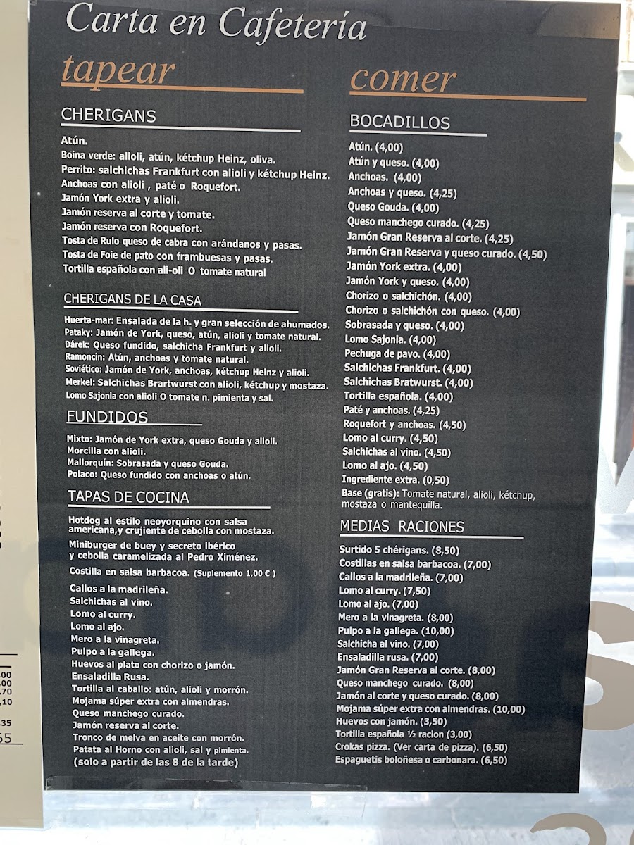 The menu is a celebration of flavors, featuring a range of enticing options that cater to all tastes. Patrons rave about the fresh vegetarian sandwiches, especially complemented by robust ingredients like beef tomato and asparagus. For a quick bite, the traditional bocadillos and savory cherigans are must-tries, particularly paired with a crisp caña or refreshing tinto de verano.